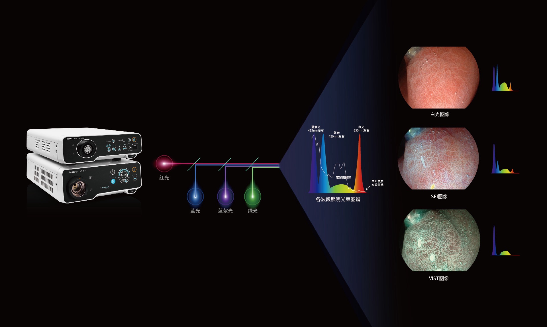 图像具有高亮度、高黏膜血管颜色对比度的特点,且不改变粘液、食物残渣、粪便的基本颜色,可在中远景下进行观察,助力消化道早期疾病的诊断。